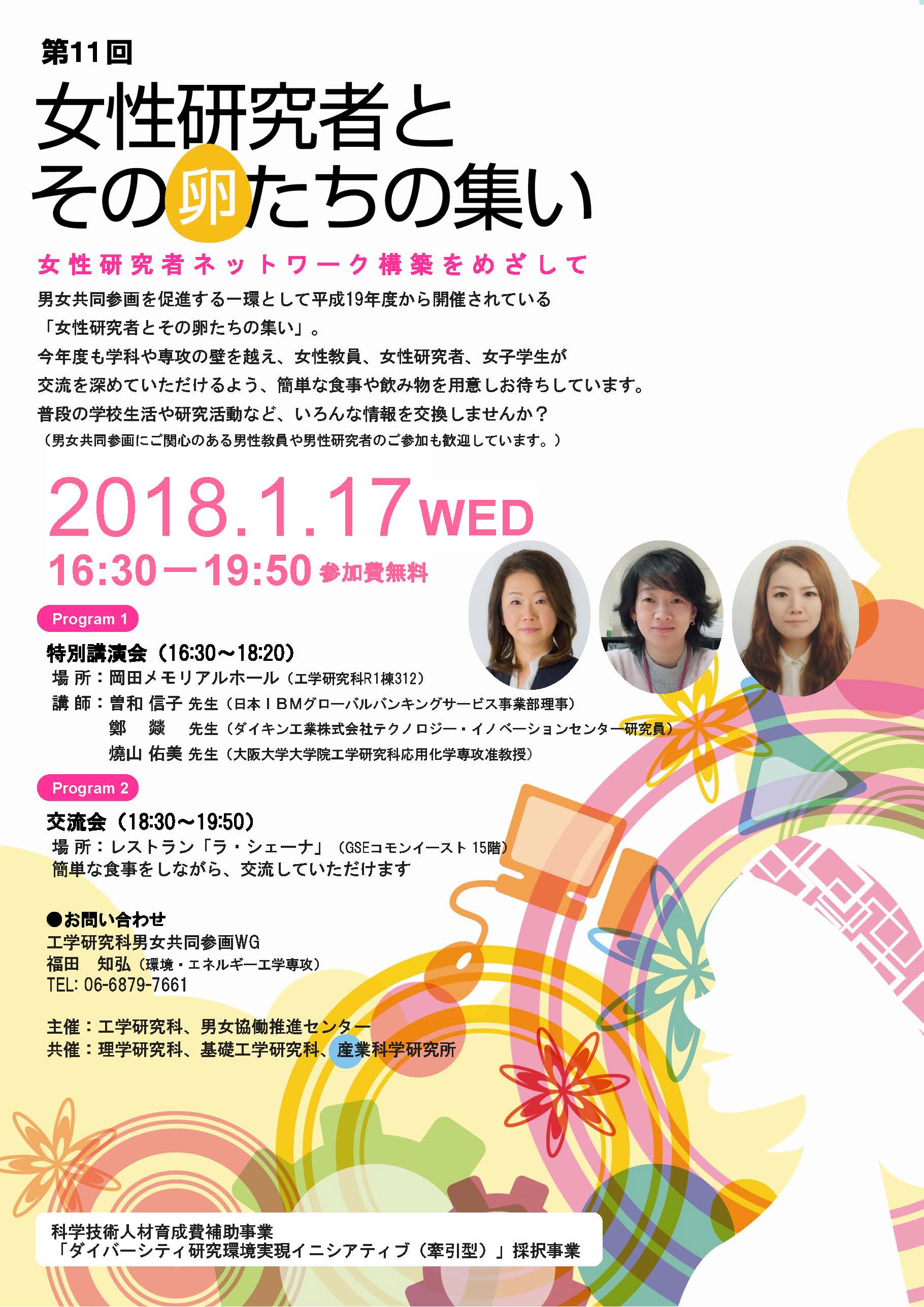 工学研究科で平成19年度から開催されている「女性研究者とその卵たちの集い」。第11回目となる今回は、ダイバーシティ研究環境実現イニシアティブ(牽引型)事業における「平成29年度男女協働推進に係るセミナー開催支援」の採択を受け、男女協働推進センターとの共同主催にて、平成30年1月17日(水)に開催されます。3名の女性講師による特別講演会と、学科や専攻の壁を越えて女性教員・女性研究者・女子学生が情報交換できる交流会は、いずれも参加無料です。男女共同参画に関心のある男性教員・男性研究者の参加も歓迎なので、お誘い合わせのうえ、ご参加ください。
