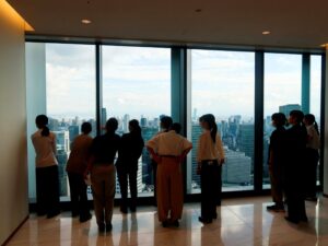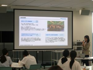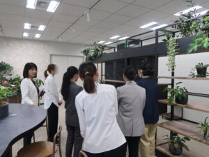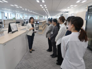 イベントでは、まず同社の会社概要と、女性活躍推進を始めとしたD&I施策のご紹介のあと、部門間の連携や多様な働き方を促進する狙いのもと設計されたオフィスや食堂等を見学させていただきました。