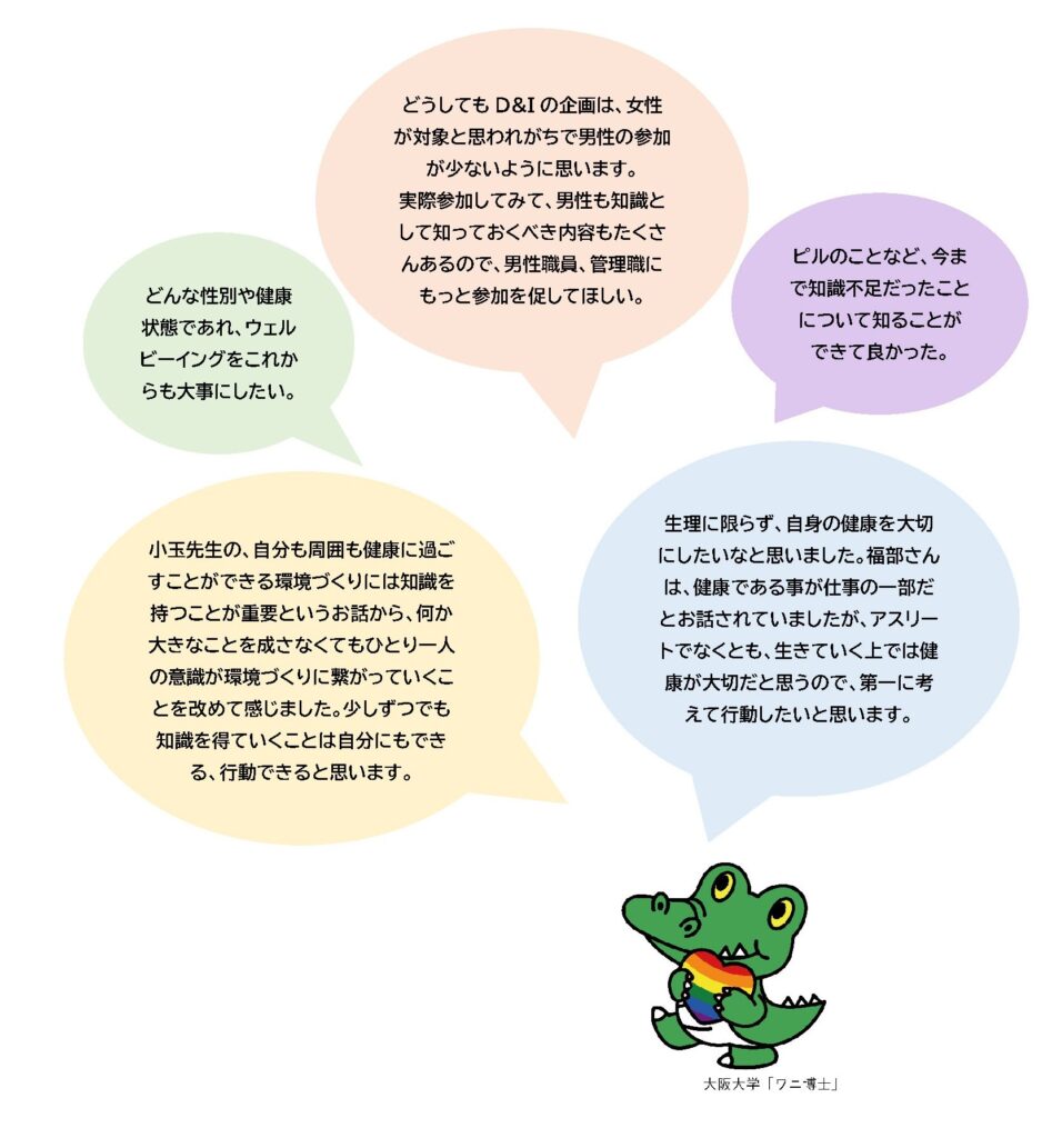 最後に、ダイバーシティ推進課から本学の生理用品提供事業の現状について説明しました。また、事前に寄せられた質問や、当日参加された学生からの質問にも、福部さんと小玉教授それぞれの立場で丁寧にご回答いただきました。教職員・学生それぞれがWell-beingを実践するための行動のヒントを得る貴重な機会となりました。