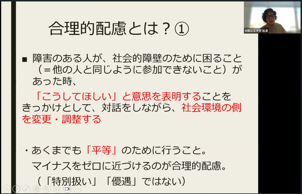 大阪公立大学アクセシビリティセンター特任准教授の松波めぐみ氏を講師としてお迎えし、約70名の本学教職員・学生にご参加いただきました。
